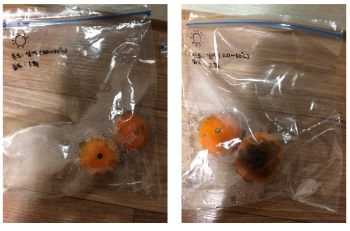 - 습도(humidity) : 귤을 비닐팩안에 넣어 스프레이를 뿌린 후 습도를 변화시켰습니다.