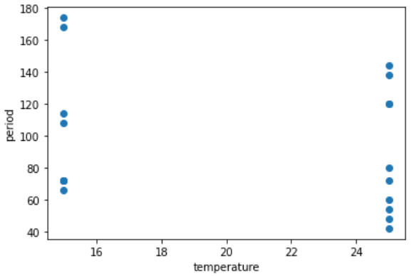 plt.scatter(df['TEMPERATURE'],df['PERIOD'])