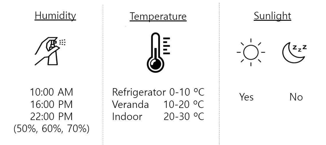 - 온도(temperature) : 냉장고(0~10도), 베란다(10~20도), 실내(20~30도) 이렇게 장소를 다르게 두어 온도를 변화시켰습니다.